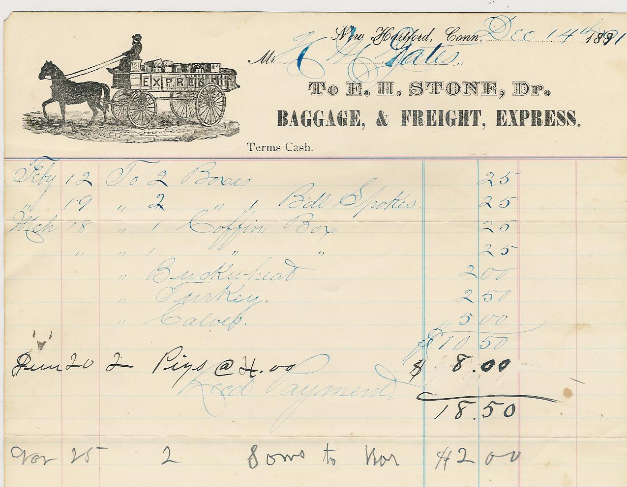 The invoice includes: 2 boxes, 2 bundles of spokes, one coffin box (so presumably no body included…), a turkey, buckwheat, catsup?, and two pigs. One may note that the two pigs cost almost as much as the rest of the loads put together. Somehow, this does not surprise me, but does suggest that the pigs were alive and unhappy!