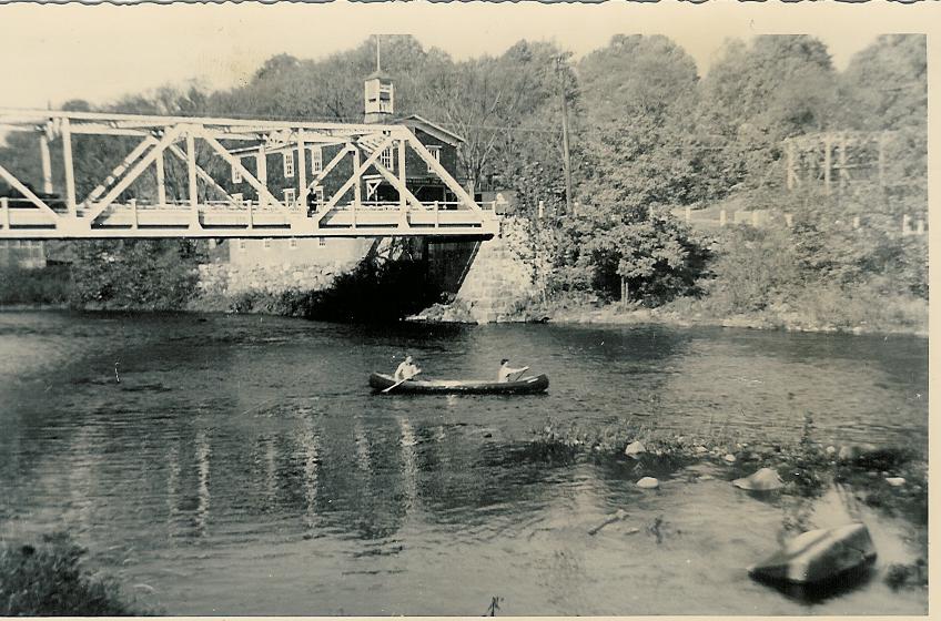 These photographs were taken sometime shortly before the 1955 Flood. It shows the Bridge Street bridge, rebuilt after the 1936 flood, that connected Bridge and Cottage Street. This alignment was changed completely after the 1955 Flood, with the creation of Route 219.