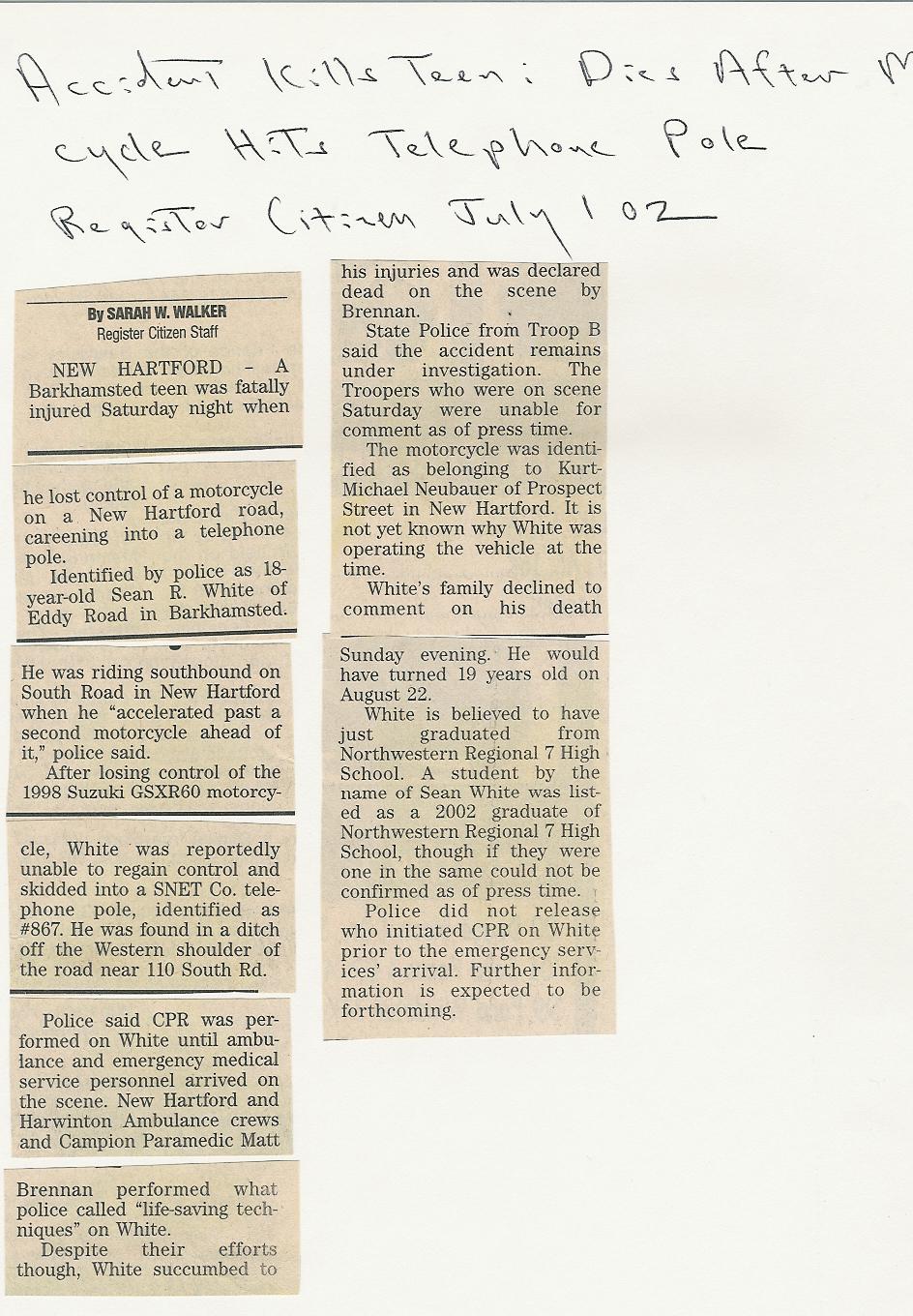 Description: Accident Kills Teen: Dies After Motorcycle Hits Telephone Pole. Register Citizen July 1, 2002. Student from Barkhamsted.