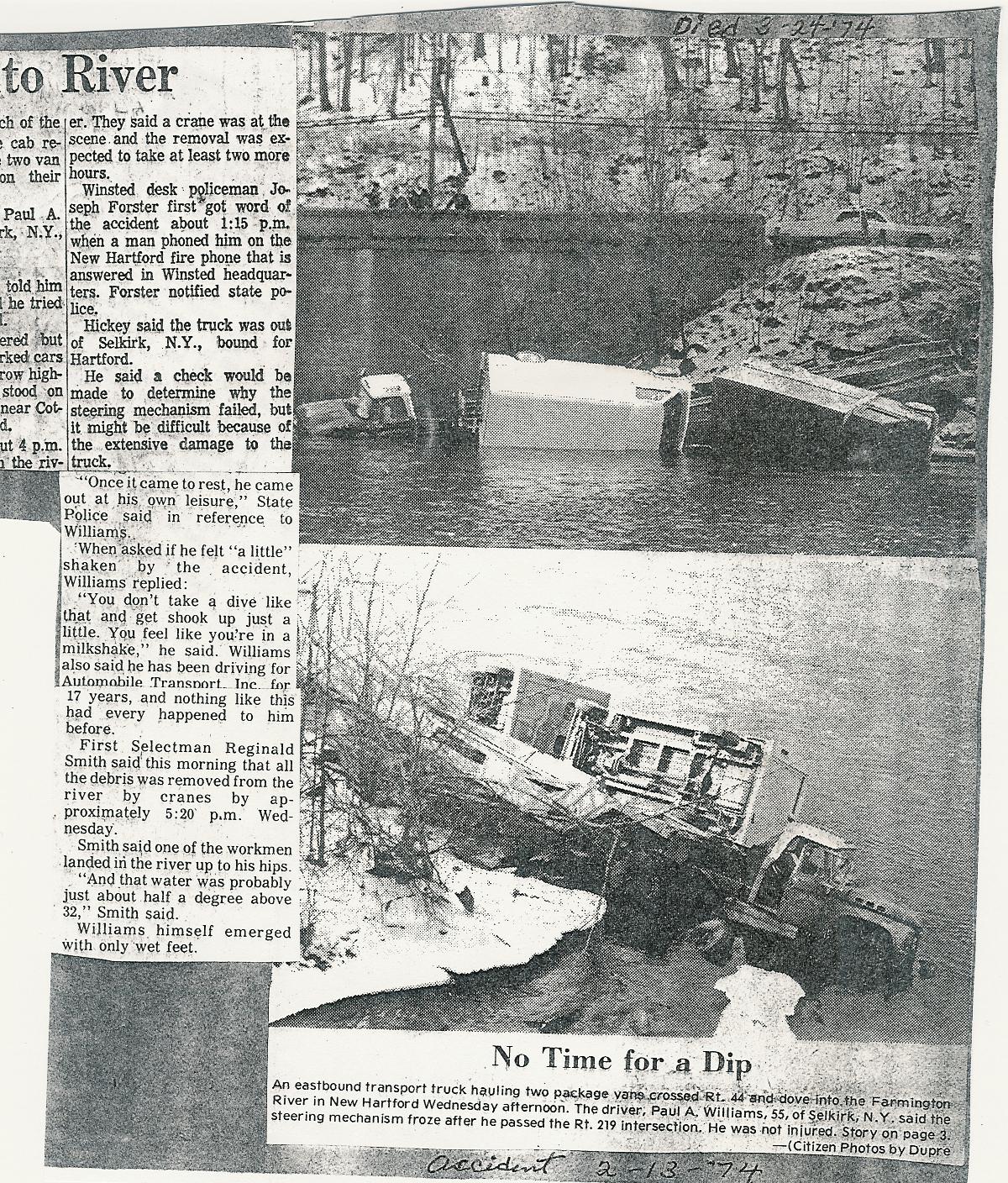 Description: Truck Crashes into River. Two news articles dating 2/13/74 (one from the Citizen paper) and one 2/14/74. A trailer truck carrying two smaller van trucks went off Rt 44 and landed in the Farmington River. Crane required to remove vehicles.